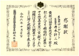 令和元年より、法務省 協力雇用主・日本財団 職親プロジェクトに加盟させて頂いております。少年院出院者及び刑務所出所者等のうち、本気で更生意欲がある方を雇用し円滑な社会復帰を支援しています。