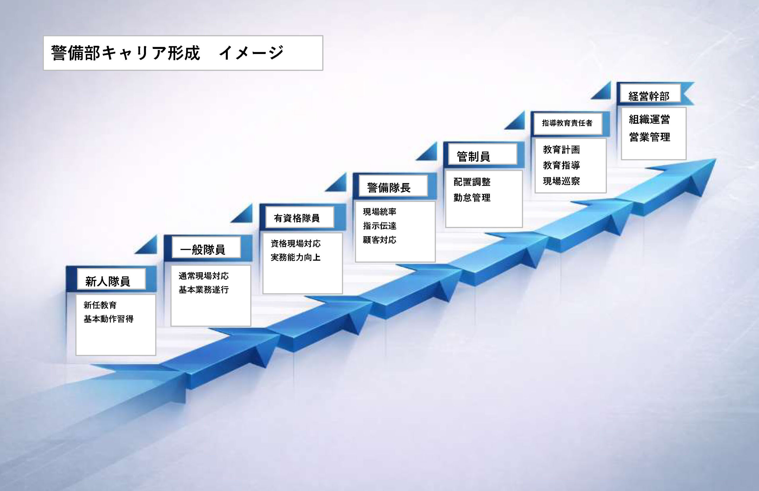 警備のプロとして、入社時の新任教育においては、誘導スキルの向上・指差呼称の徹底など技術の習得を図っています。そして、定期的な巡察によるOJT指導であり、集合座学教育によって、更なる警備力を高めています。また、交通誘導2級を保有する多数の資格者も在籍し、活躍しております。
